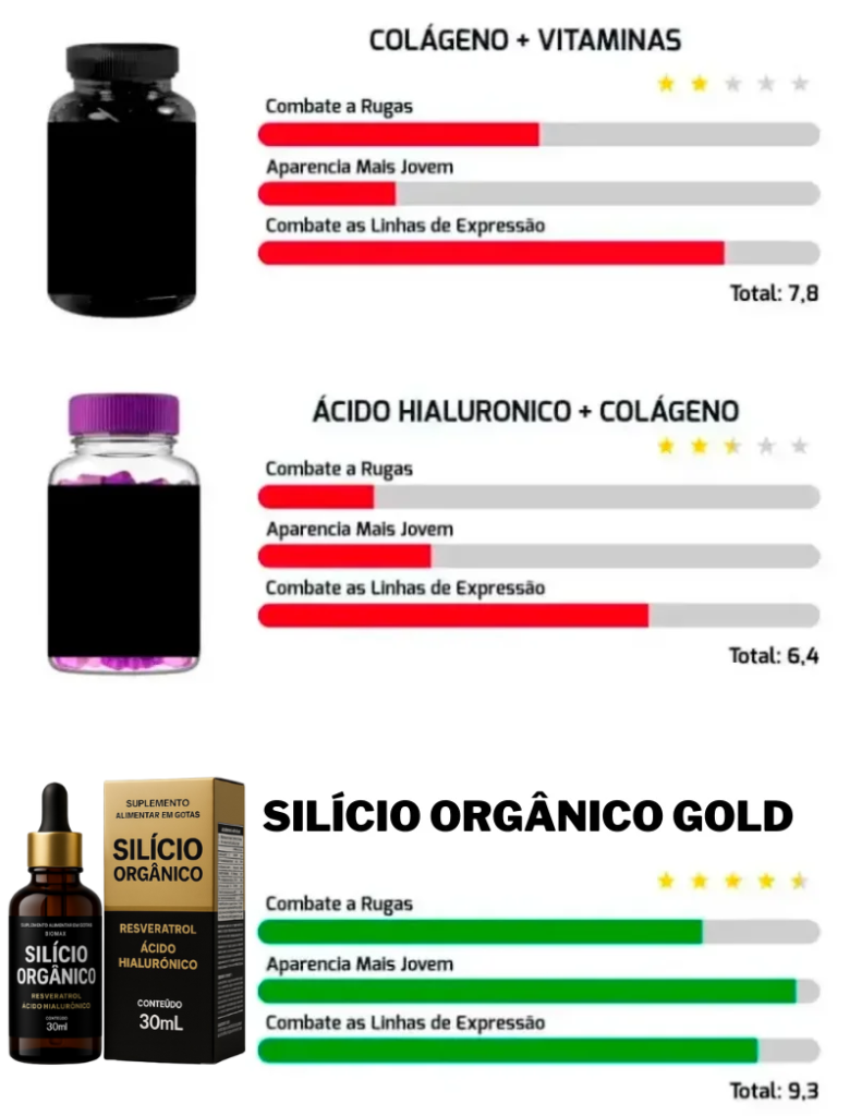 Fizemos testes em laboratório com o Silício Orgânico Gold para comparar sua eficácia em relação a outros produtos para pele que estão disponíveis no mercado brasileiro. Para isso, analisamos os 15 produtos mas vendidos e verificamos que NENHUM desses produtos contém como base o Silício Orgânico em conjunto com Ácido Pantotênico e Ácido Hialurônico. Eles apresentam apenas colágeno e ácido retinoico como ingrediente principal.